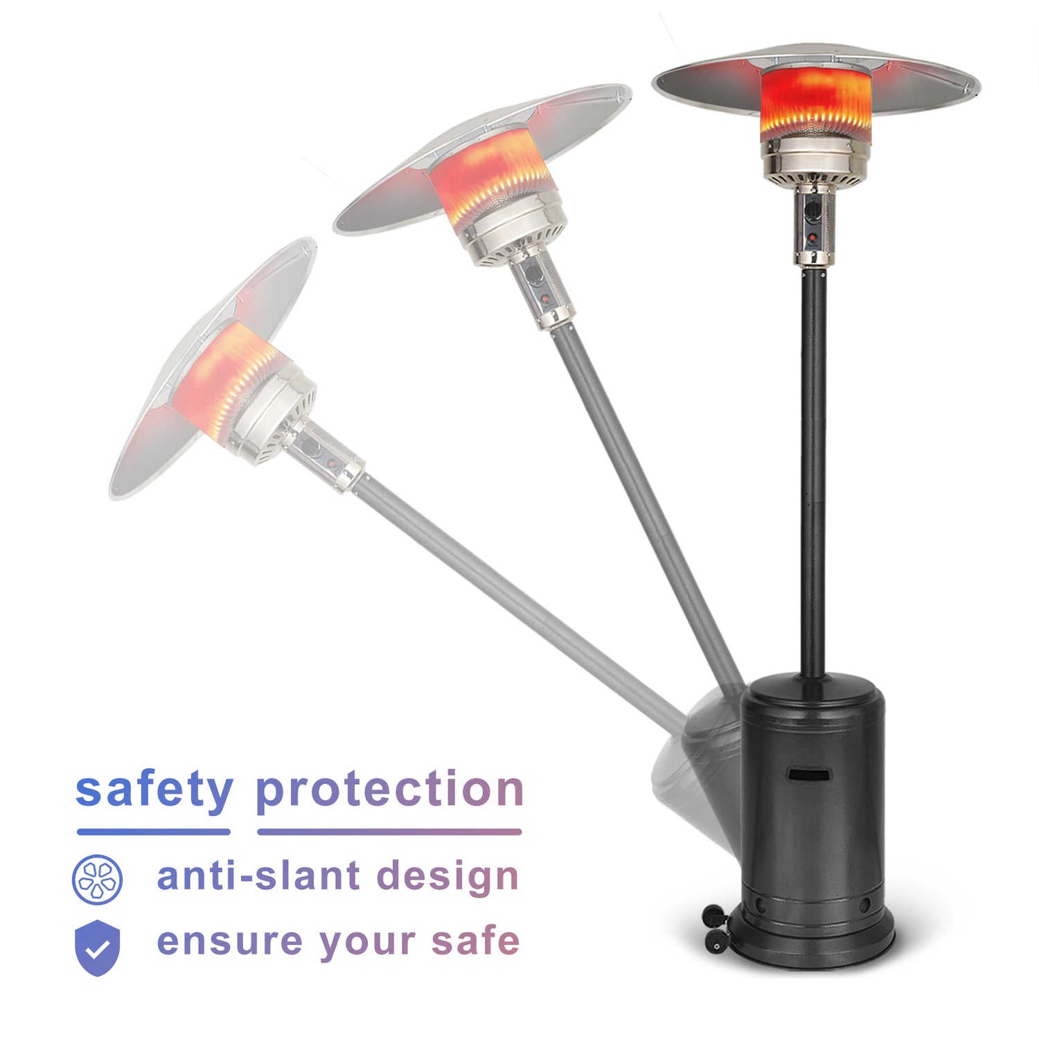 - SAFETY & CERTIFICATE - UPHA LP Outdoor Heater adopts an anti-slant design with a built-in safety valve that turns the space heater off automatically if it gets tipped over. The heating element is made of high-quality stainless steel, which is not easy to melt or burn. It also complies with ANSI and ETL standards and specifications, which can ensure its high quality and make you feel relieved to use it.