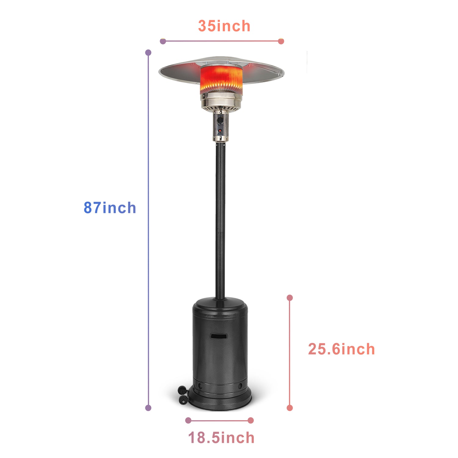 - EFFICIENT HEATING - 46000 BTU Patio Propane Deck Heater's dimension is 18.5-inch x 18.5-inch x 87-inch. Stainless steel burners range up to 18 feet in diameter. whether it is for residential use (courtyards, terraces, lawns, balconies) or commercial use (restaurants, parks, outdoor cafes), UPHA Outdoor Propane Heater will deliver 10 hours of comfortable temperature at the end of autumn and winter nights for you and your family.