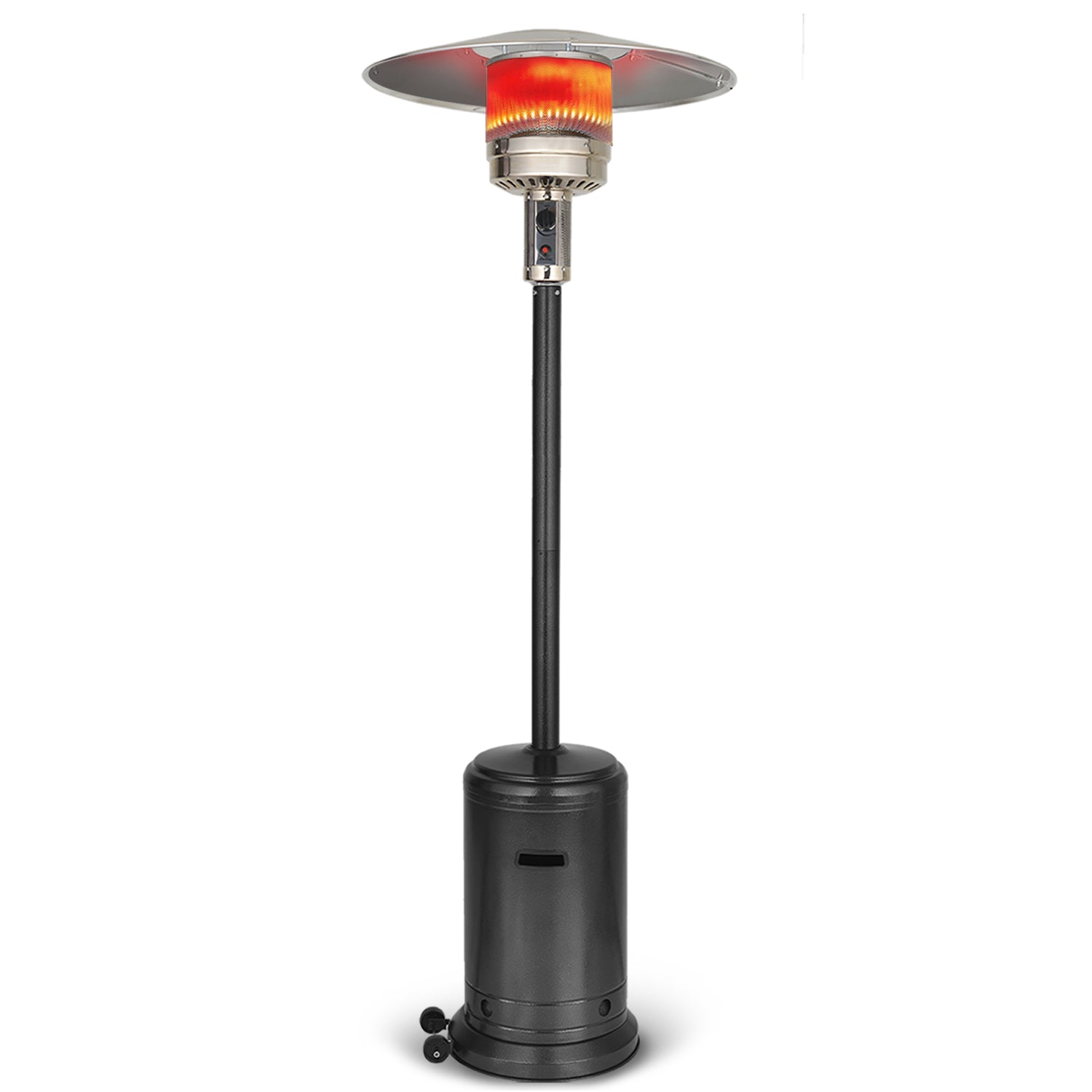 - EASY TO OPERATE - UPHA Large Patio Heater is equipped with a ignition button and a variable-heat control knob. Press and hold the button for 90 seconds to activate the ignition system, the variable-heat control knob can be set to low heat or high heat, and the gas heater lamp will be completely turned off at the end of the night. Two smooth-rolling wheels make it easy to move wherever you need it.
